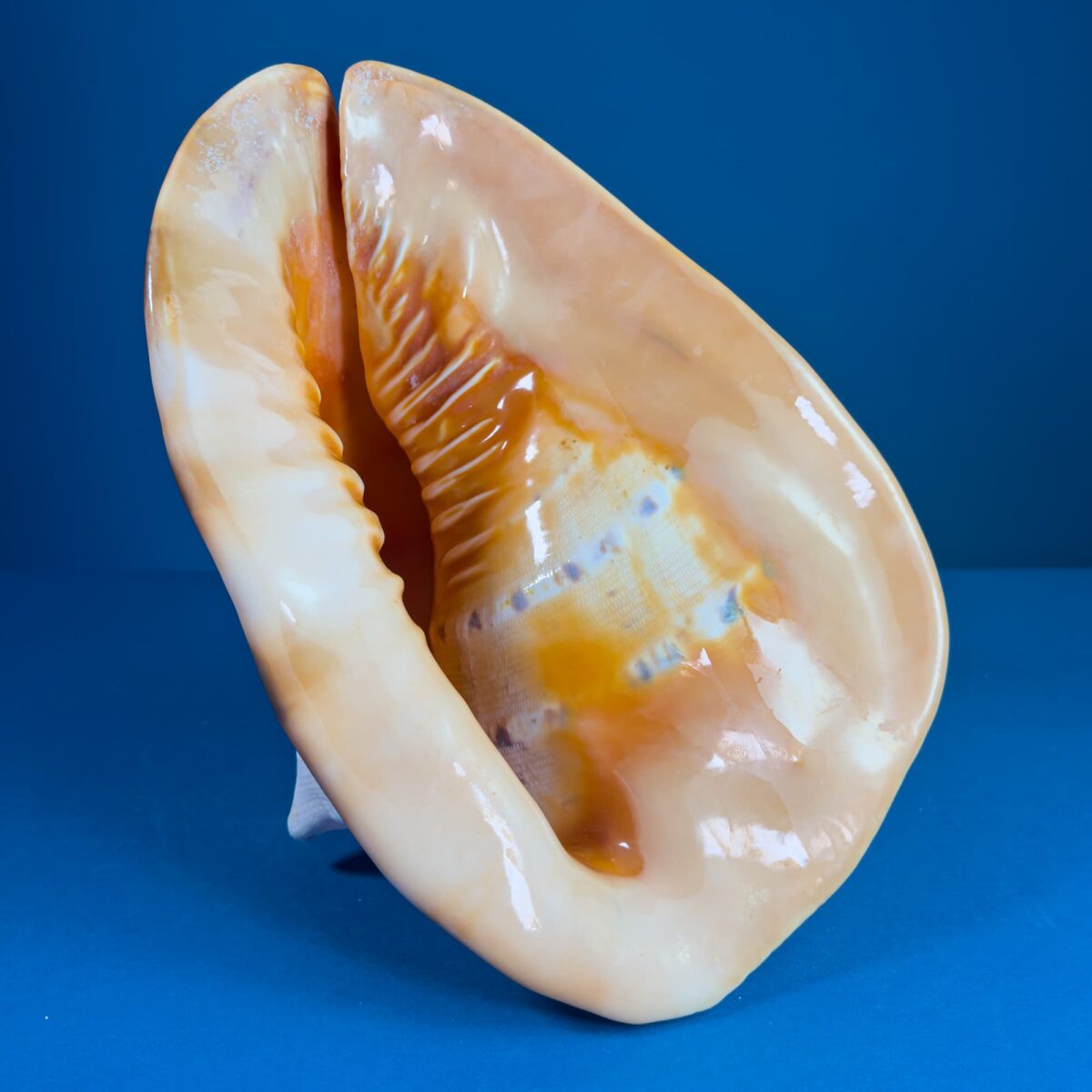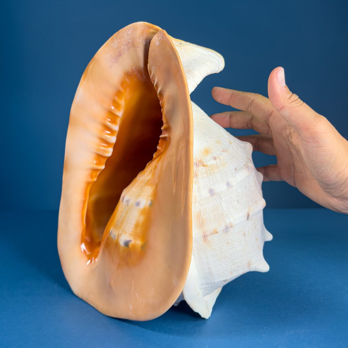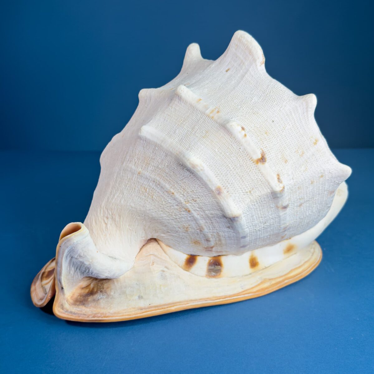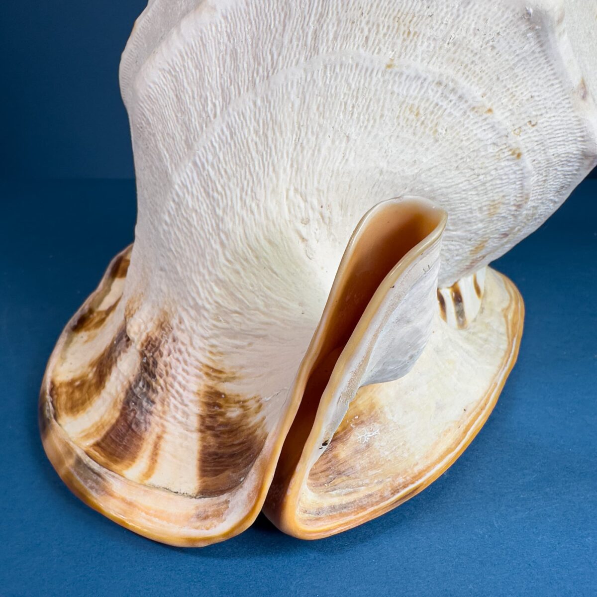 Bring the beauty of the sea into your home with this stunning Cassis Cornuta, also known as the Queen Helmet Shell. Measuring an impressive 30.5 cm, this natural marine treasure is admired for its bold ridges, rich caramel tones, and creamy white inner whorls — a true collector’s piece.