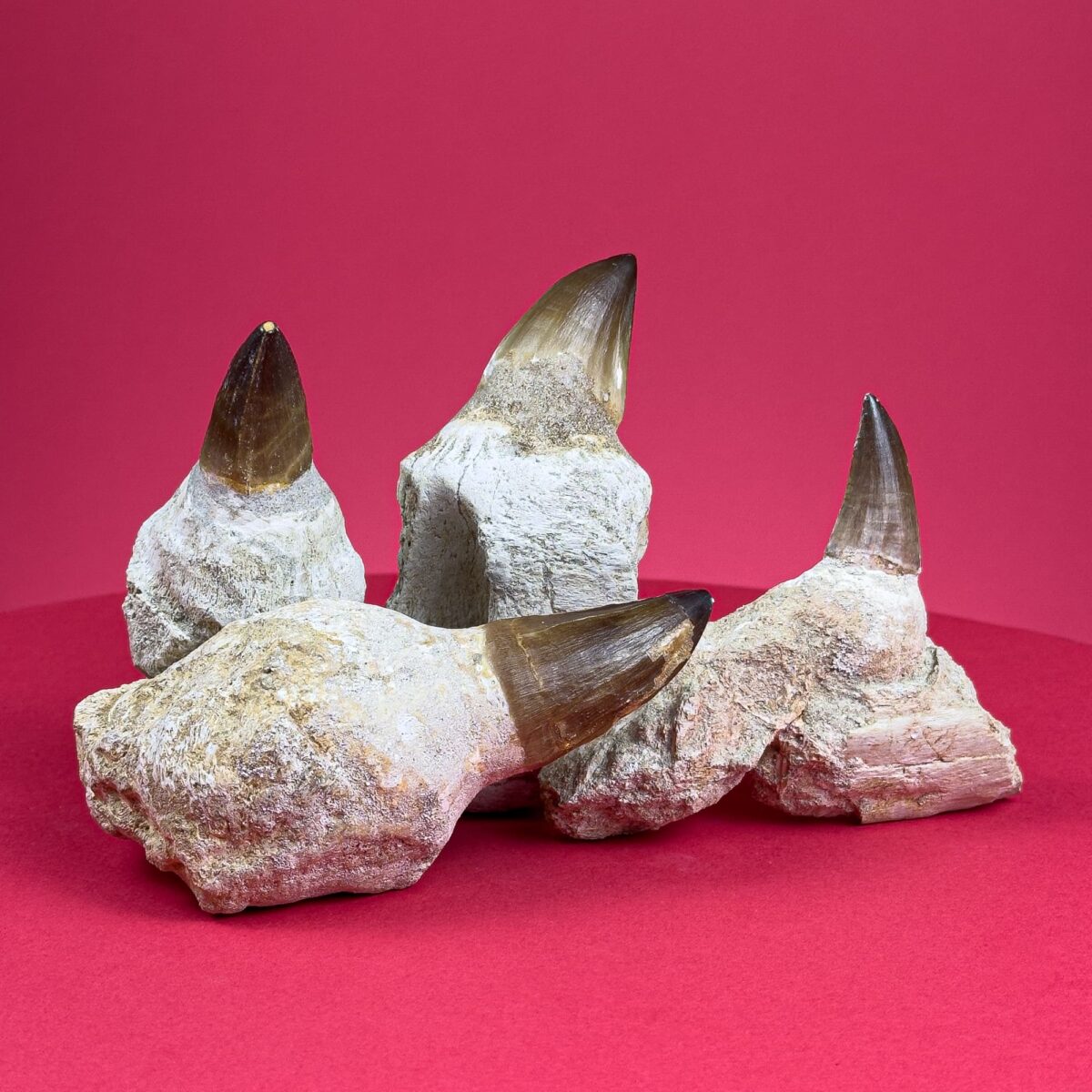 Each tooth, accompanied by a section of the jaw, is carefully extracted and preserved, showcasing the distinct serrations and robust structure that characterized the powerful bite of this ancient predator. The inclusion of the jaw fragment adds an extra layer of authenticity and insight into the anatomical structure of the Mosasaurus.