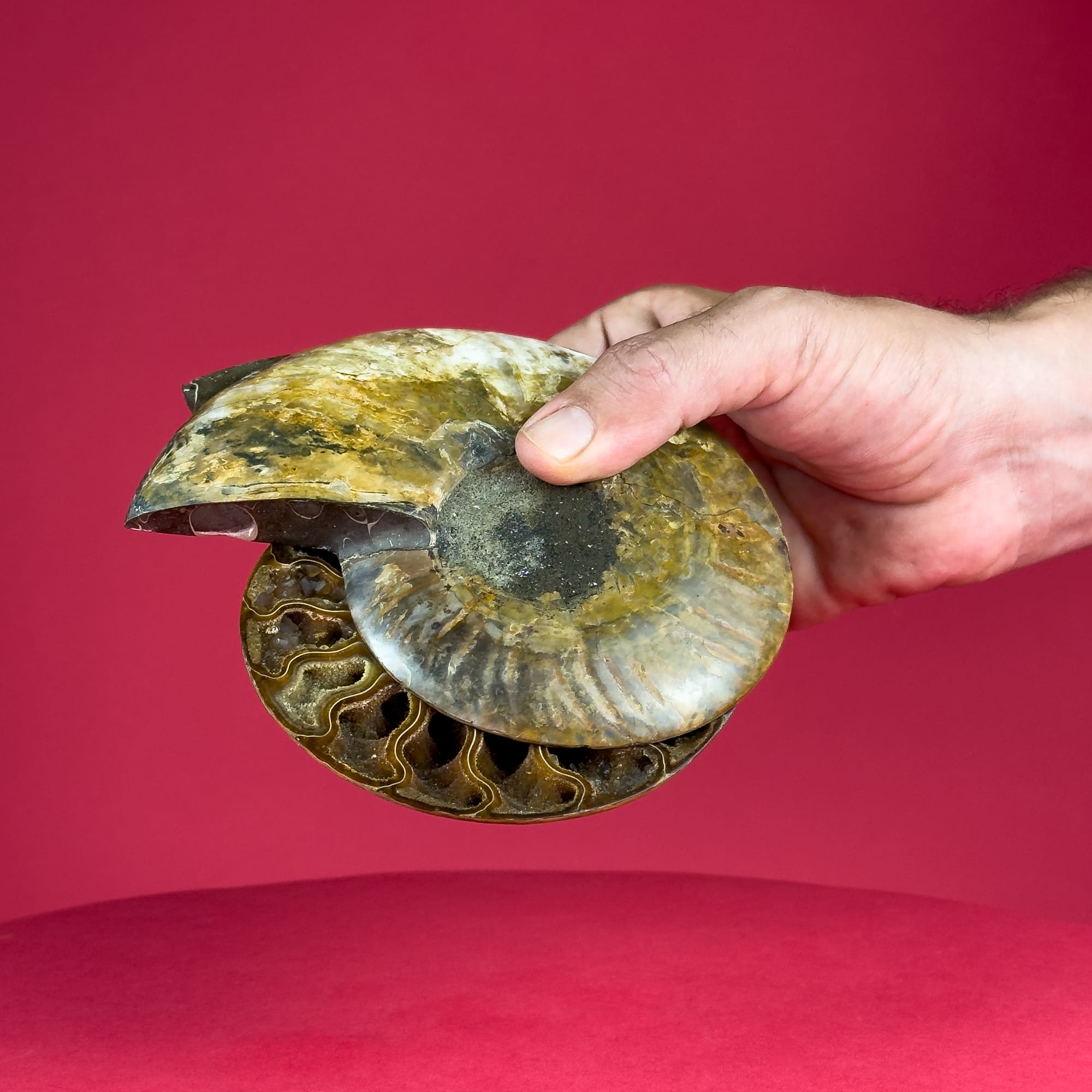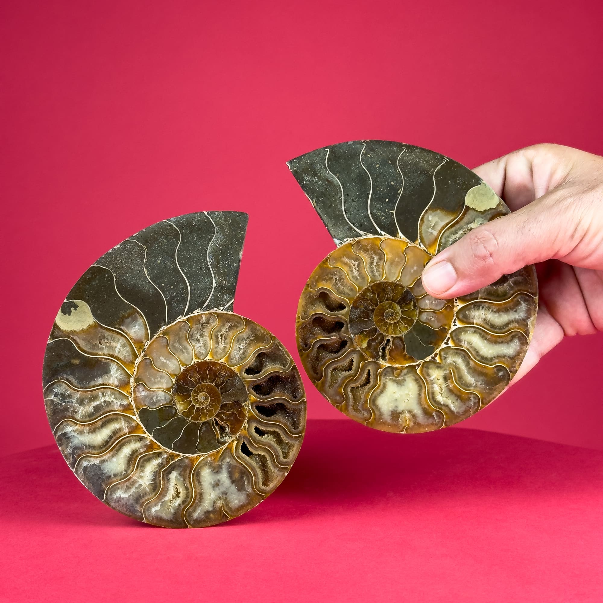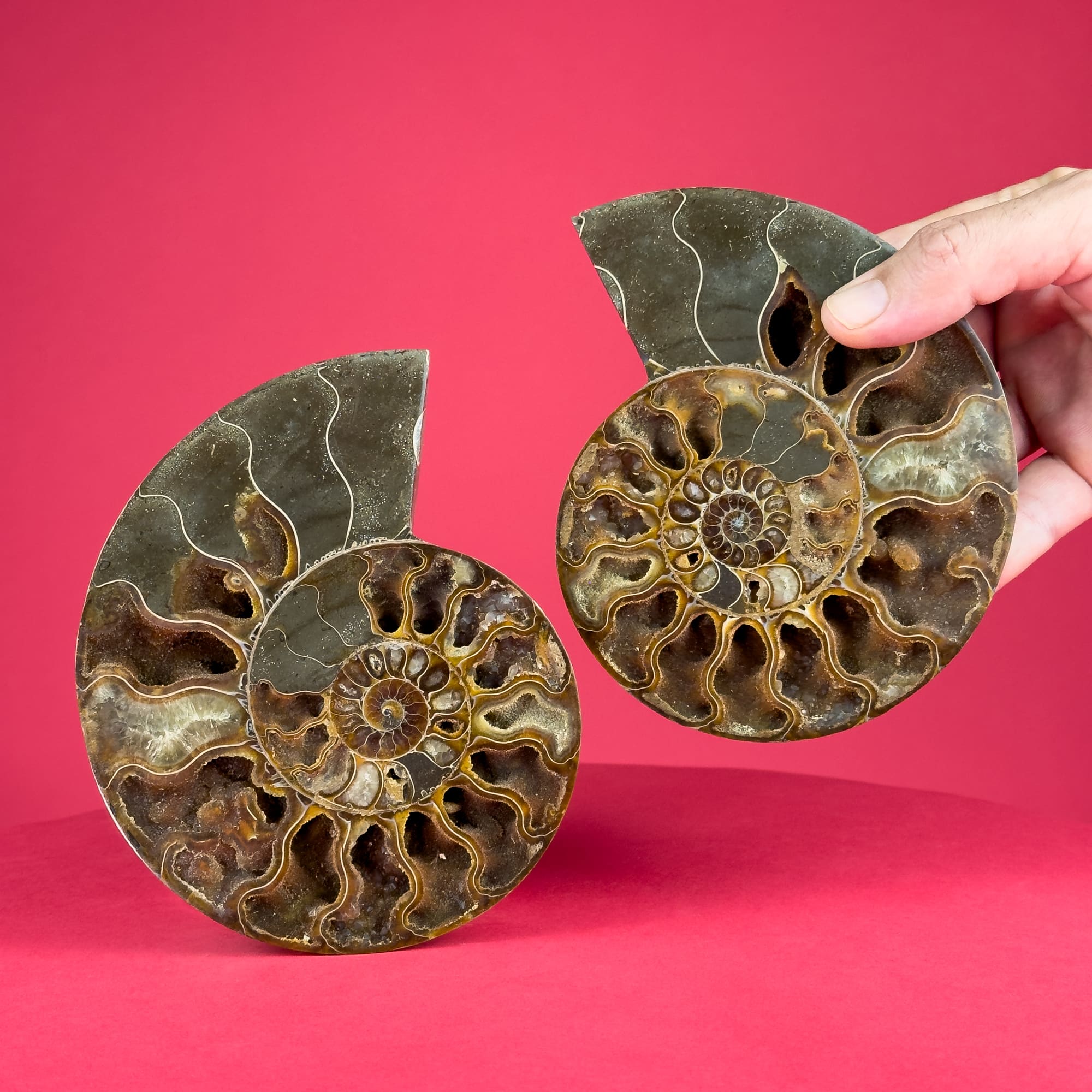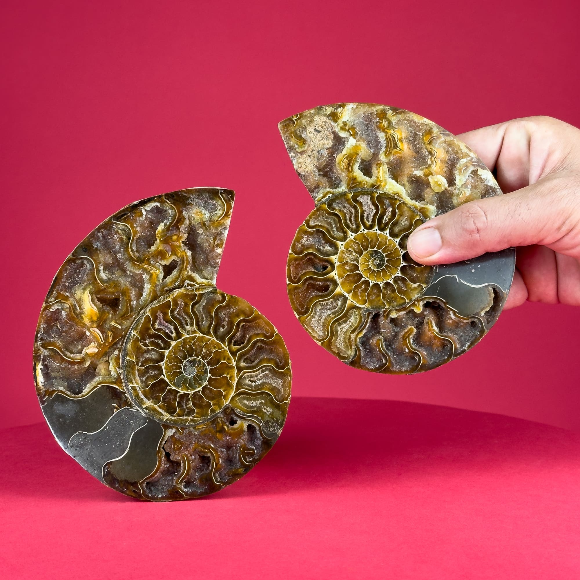 These 14-15 cm sectioned ammonite fossil pairs from Madagascar are a true marvel of nature. The outer shell exhibits a breathtaking display of iridescent colors, creating a dynamic and eye-catching piece. Upon opening, the fossil’s interior reveals an intricate landscape of mineral formations, offering a unique glimpse into the distant past. These fossils are perfect for display, adding a touch of natural elegance and wonder to any space.