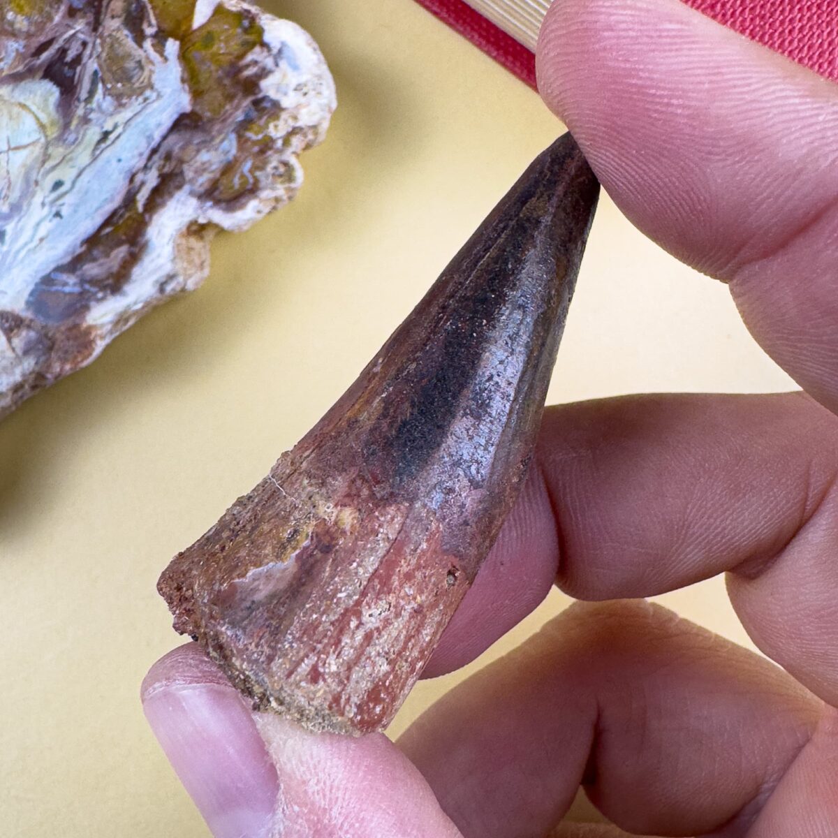 Unearthed from the fossil-rich beds of the Kem Kem Formation in Morocco, this 54mm Spinosaurus tooth is a remarkable specimen from one of the most iconic theropod dinosaurs of the Cretaceous period. With its distinct conical shape and well-preserved enamel, this fossil offers a tangible connection to a prehistoric predator that once dominated the ancient river systems of North Africa. A must-have for collectors and dinosaur enthusiasts.